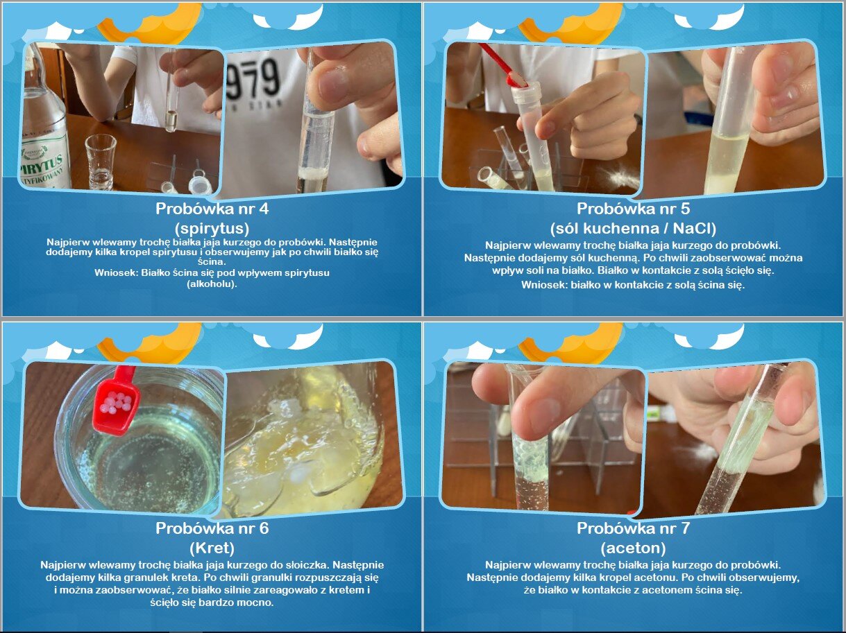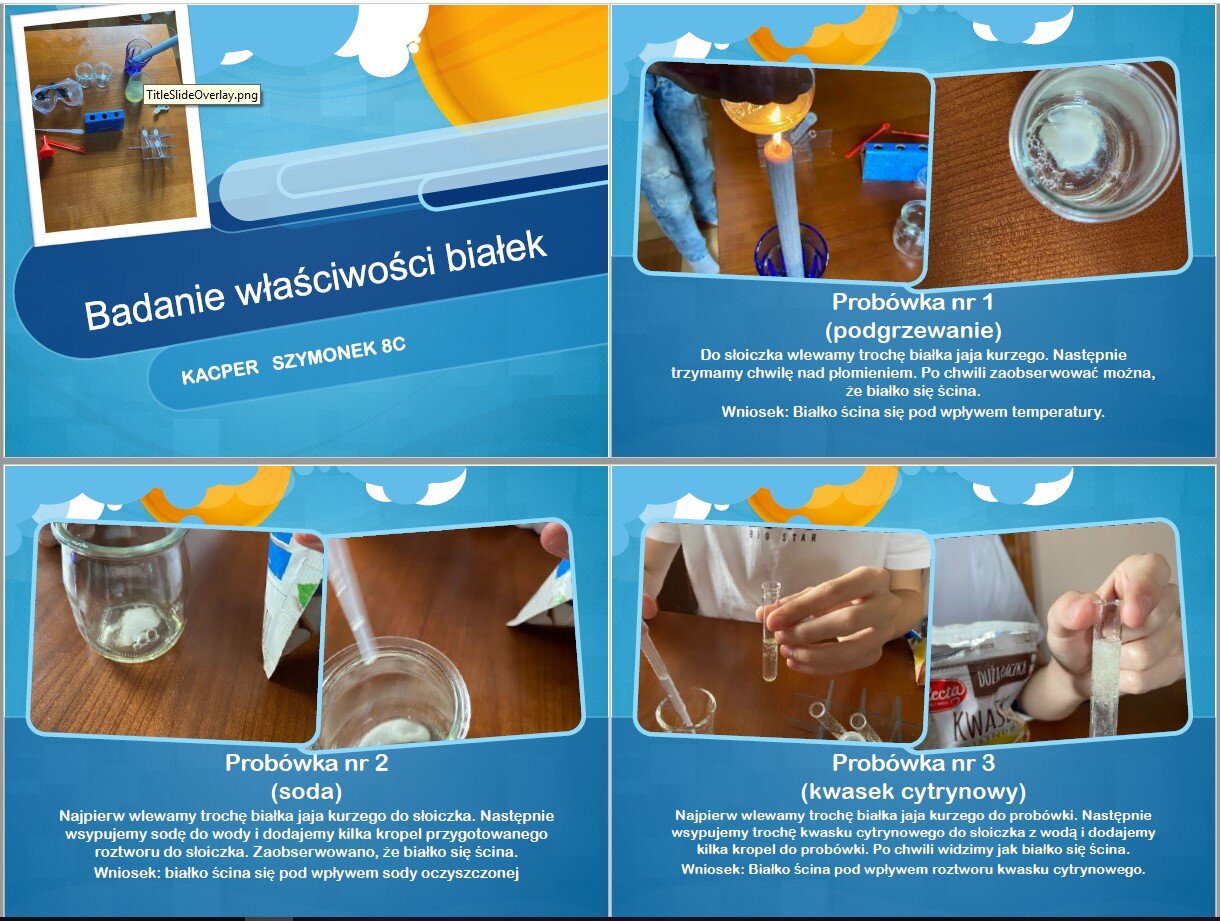 Uczniowie klas 8 w ramach lekcji chemii przygotowywali samodzielnie doświadczenie pt. "Badanie właściwości białek", pod kierunkiem p. Marty Raczyńskiej-Żak. Wszyscy uczniowie wykazali się dużym zaangażowaniem i pomysłowością, a efekty pracy kilku z nich można zobaczyć poniżej.