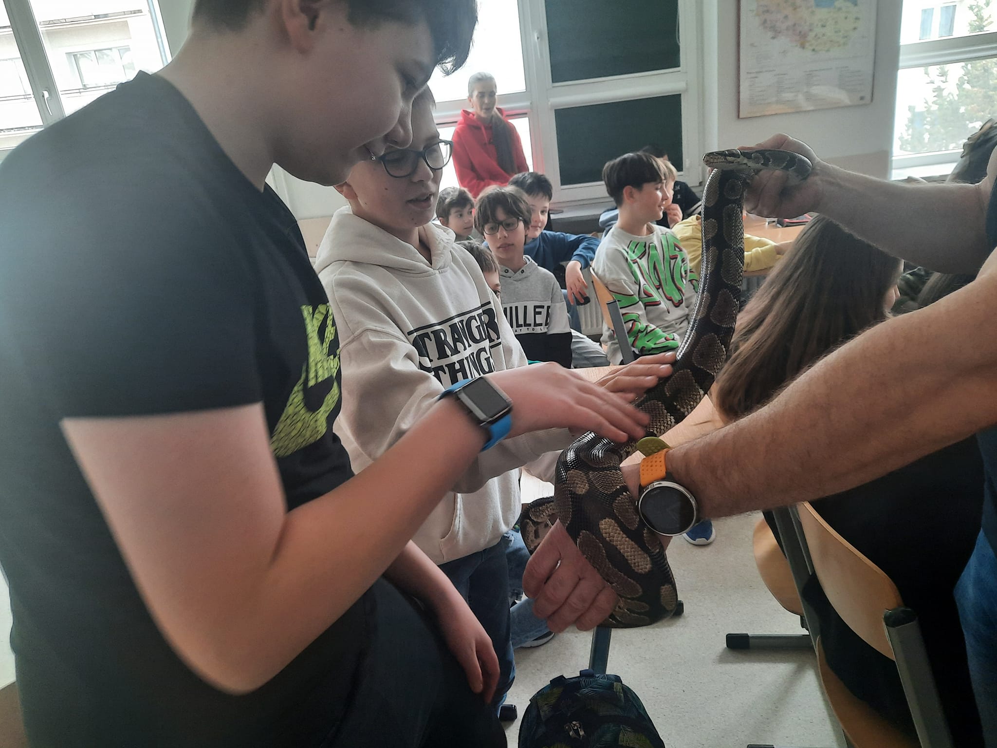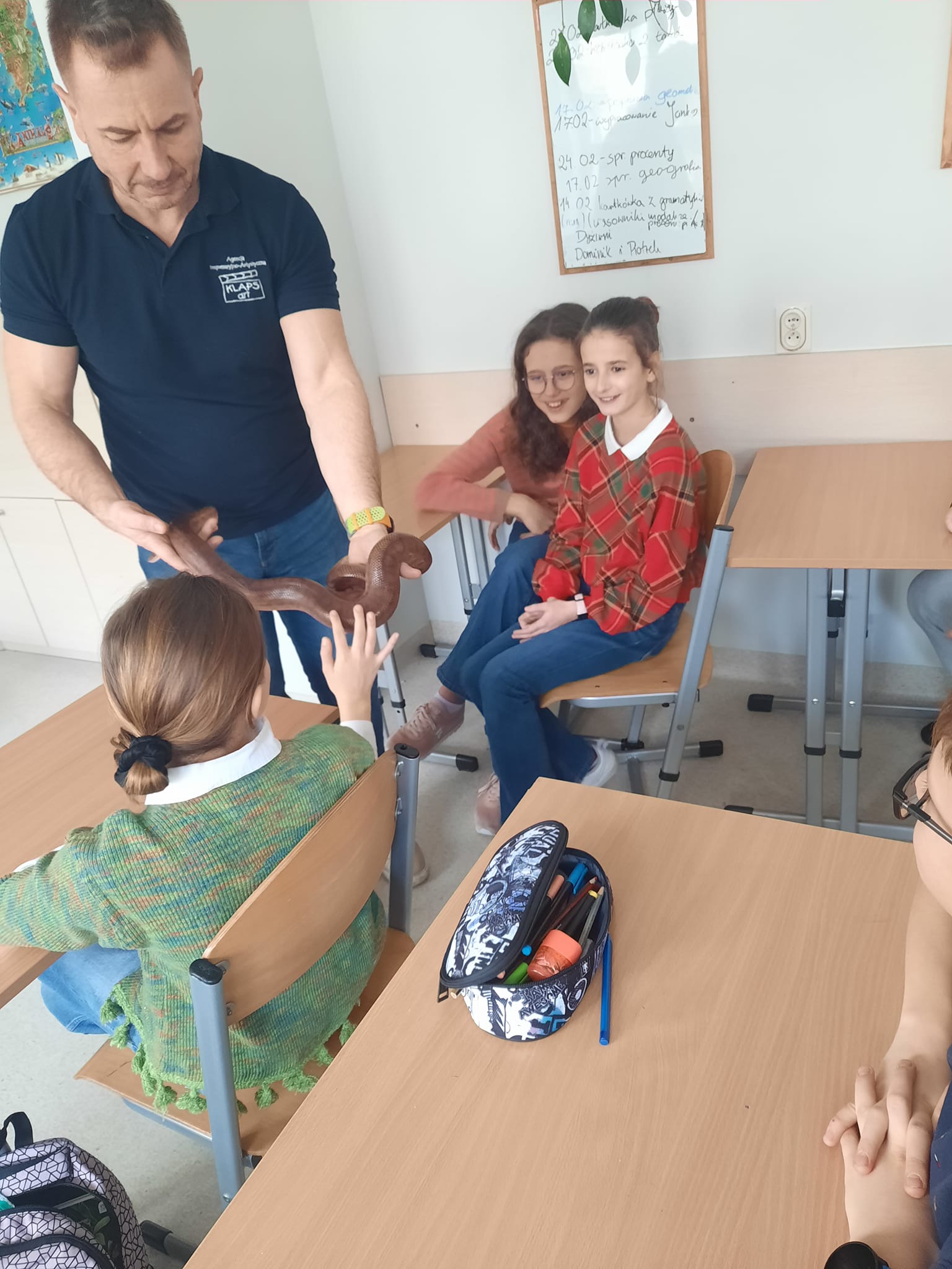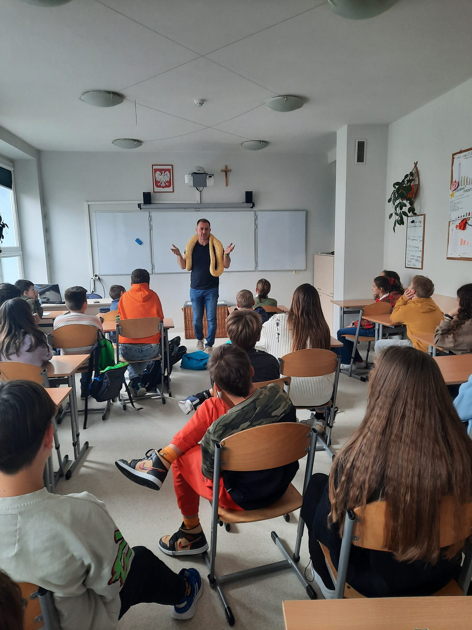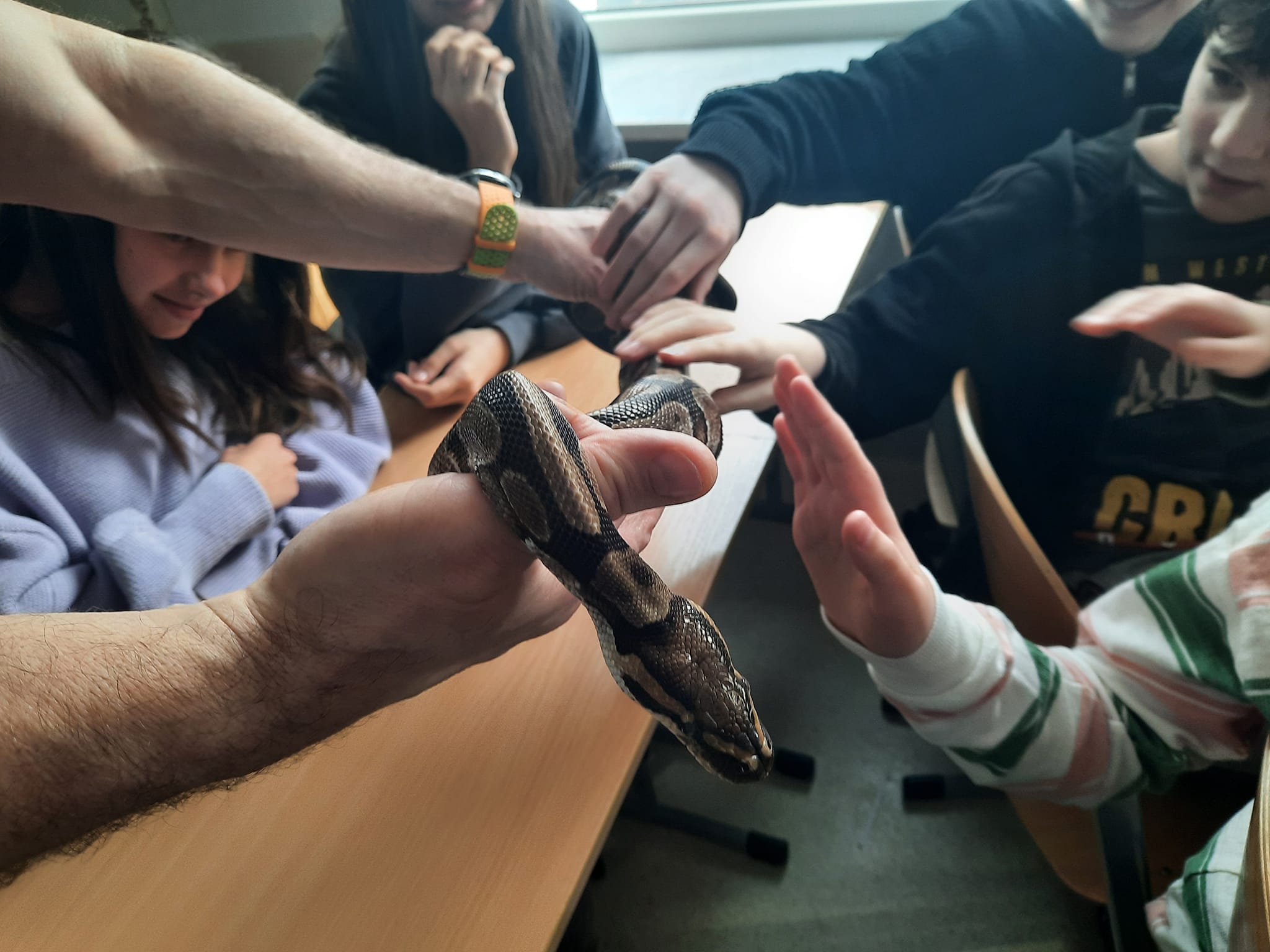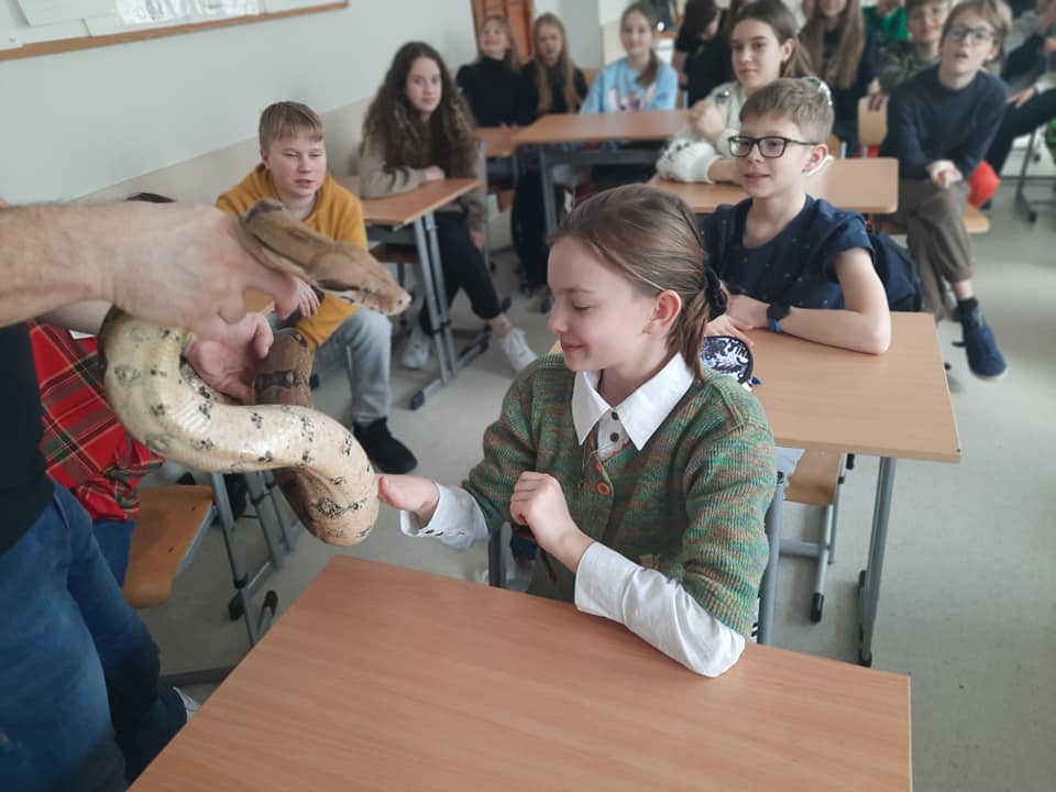 Uczniowie mieli okazję poznać biologię gadów, cechy charakterystyczne budowy, przystosowania do życia na lądzie oraz wiele ciekawych informacji na przykładzie kilku gatunków egzotycznych węży - m.in. pytona królewskiego, boa tęczowego, boa dusiciela, czy pytona tygrysiego-albionsa.