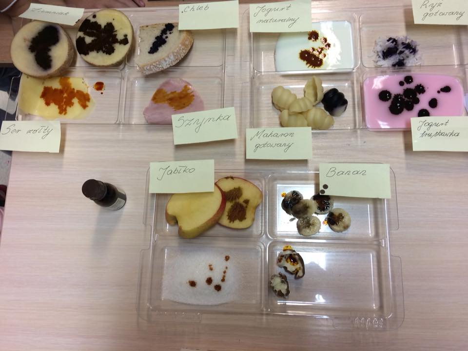 W poszukiwaniu skrobi... Klubowicze już wiedzą, że nie zawsze cukier ma słodki smak. Na warsztatach uczniowie wykrywali skrobię w różnych produktach spożywczych. Postawiona na wstępie hipoteza została zweryfikowana eksperymentalnie.