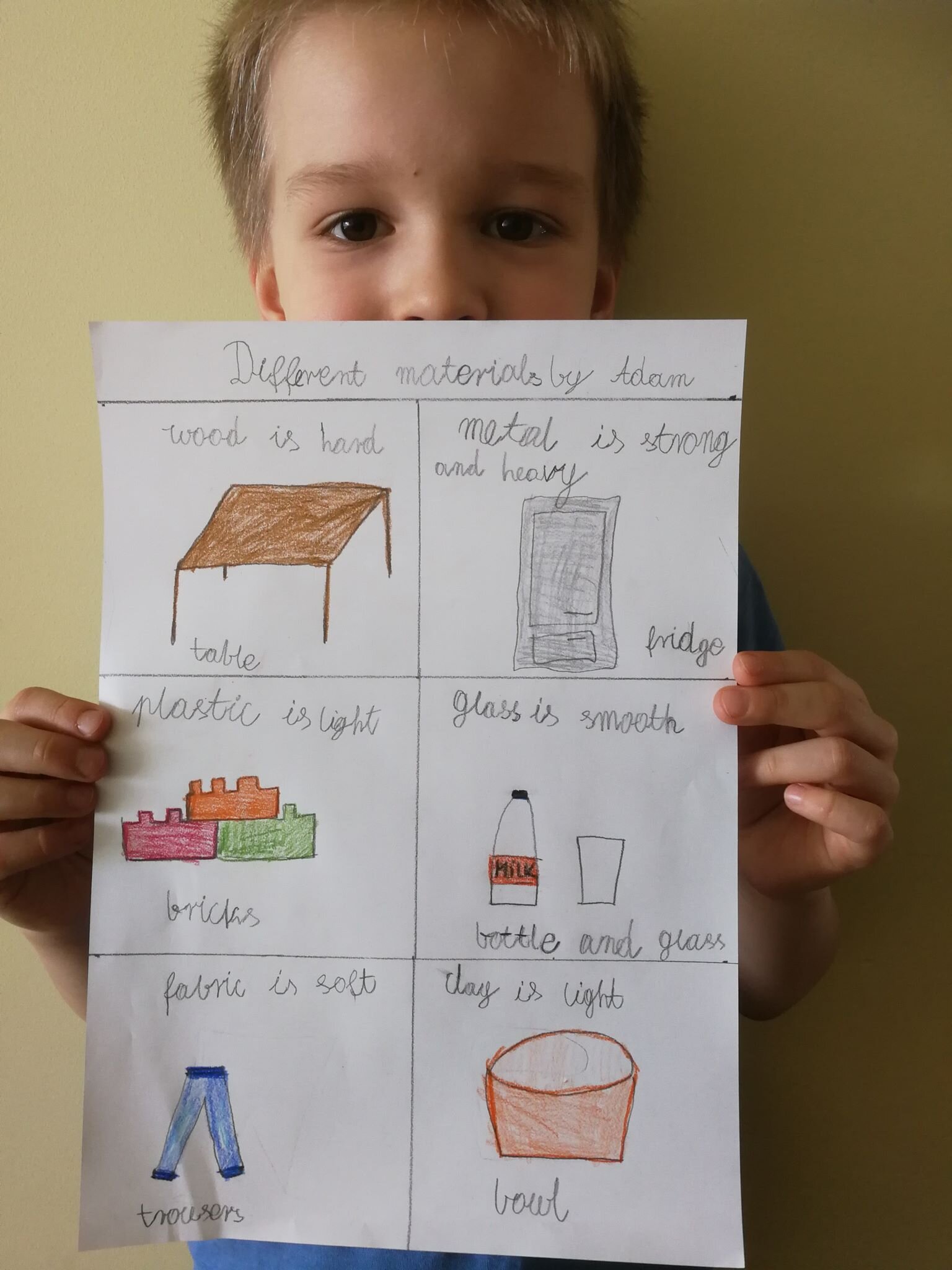 Wiedzę na temat wykorzystywania różnorakich materiałów w życiu człowieka zgłębiali uczniowie klasy 1b podczas zajęć Clil. Wood, paper, clay, leather, glass czy metal, to tylko niektóre materiały bliżej zbadane przez uczniów. Co można wykonać z bawełny, metalu czy skóry? Czy ten materiał jest delikatny czy bardzo wytrzymały? Jak nazywają się osoby, które wytwarzają przedmioty z gliny czy z drewna? Na te wszystkie pytania potrafią już odpowiedzieć pierwszaki. Brawo!!!